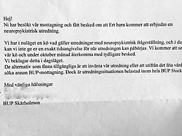 – Detta brev fick vi från BUP Skärholmen i september förra året. Sedan dess har det varit tyst: