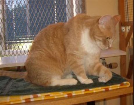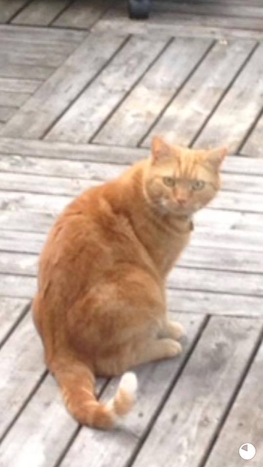 Kännetecken: Han är en rödtigrerad hane, stor till vikten, har en speciell gångstil pga en gammal skada och är ca 15 år gammal. Hans ID tatuering syns tyvärr inte längre.