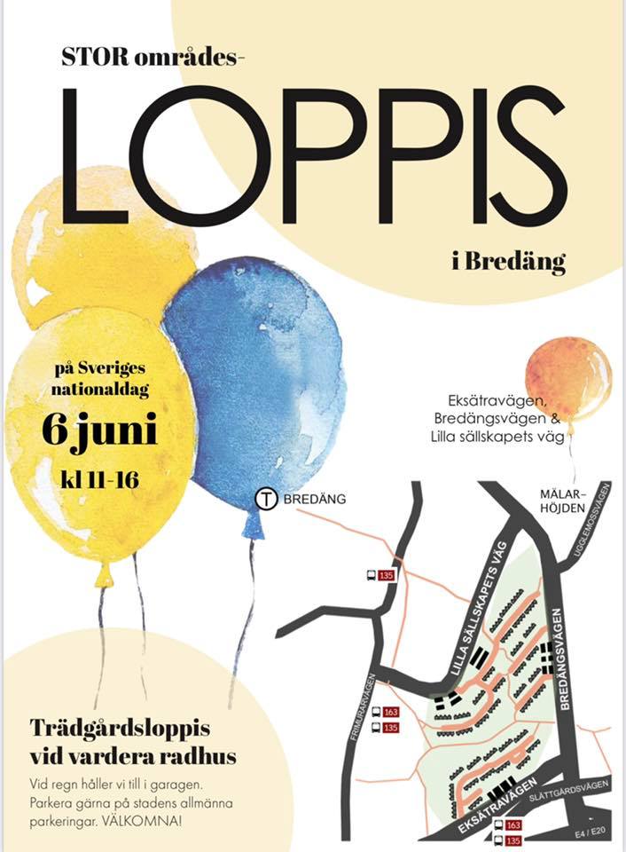 Bellmansringens samfällighet anordnar loppis i trädgårdarna. (Vid regn håller vi dock till i garagen) Följ skyltning och håll utkik efter ballonger!