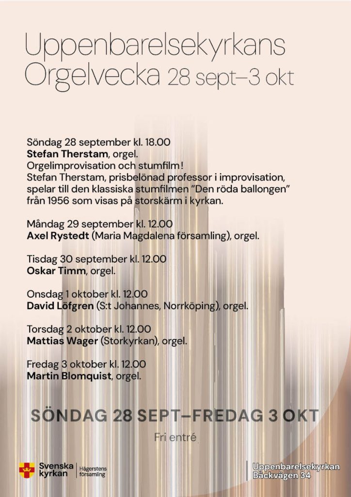 ”28/9 kl 18.00 kommer stumfilmsklassikern ”Den röda ballongen” visas på stor duk i Uppenbarelsekyrkan. Professor Stefan Therstam kommer att improvisera till på kyrkans orgel. Jag har upplevt detta förut, det är en upplevelse!” Berättar organist Martin Blomquist