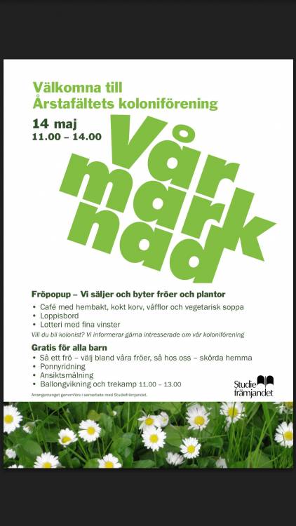 Årstafältets koloniområde Ersta Gårdsväg, Stockholm, Stockholm, SverigeFör barnen: ponnyridning, ballongvikning, ansiktsmålning, "så ett frö" […]