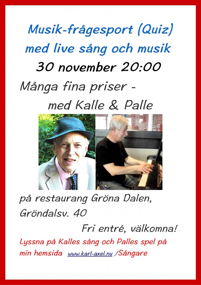 En spännande och rolig musikfrågesport med kända låtar från början av 1900-talet till och med de senaste melodifestivals-låtarna, denna gång med jul-anknytning. Live sång och piano.
