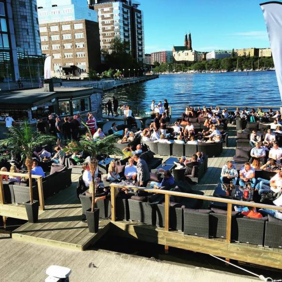 Restaurangen med utlandsk känsla omringat av vatten, båtar som även ger en känsla av skärgårdsidyll mitt i stan.