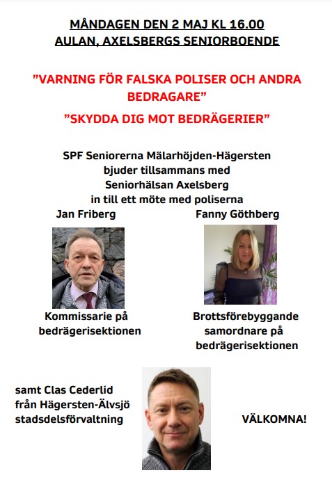 SPF Seniorerna Mälarhöjden-Hägersten bjuder tillsammans med Seniorhälsan Axelsberg in till ett möte med polisens bedrägerisektion – Jan Friberg, Kommissarie, och Fanny Göthberg, Brottsförebyggande samordnare, samt Clas Cederlid från Hägersten-Alvsjö stadsdelsförvaltning.