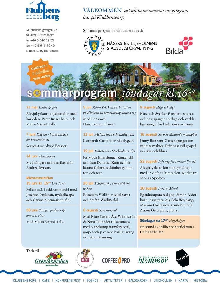 Snart är det sommar och det betyder sommarprogram på Klubbensborg! Varje söndag kl.16 är det musikuppträdande i Café Uddvillan och vi börjar nu på söndag den 31 maj med Älvsjökyrkans ungdomskör med körledare Peter Brisenheim och Malin Värmå Falk. Välkomna!
