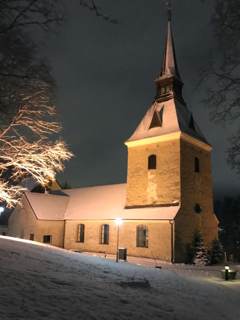 Mellan säga pampiga gamla villor och församlingshemmet när vi urgamla Brännkyrka kyrka. Nutida altarskepp av Bertil Vallien. På kyrkogården ”Årstafruns” grav.