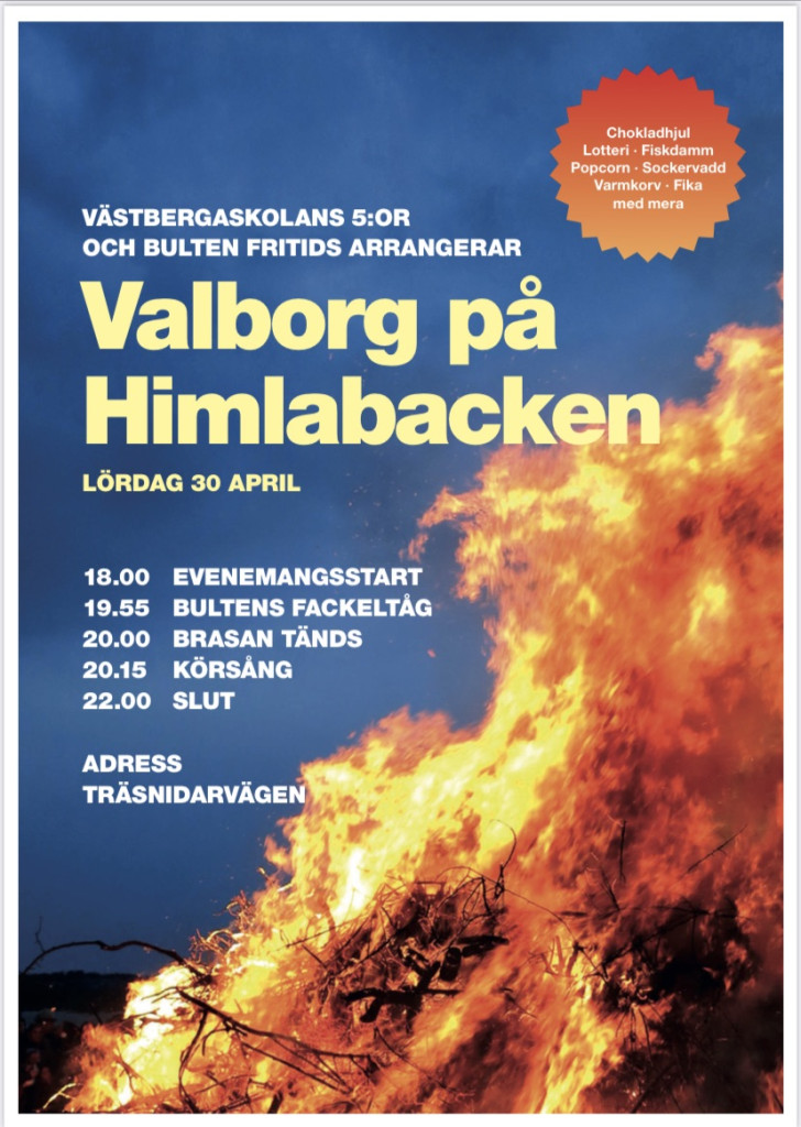 valborgseld, chokladhjul, fiskdamm, lotteri, sockervadd, popcorn, mat och dryck. Arrangeras av