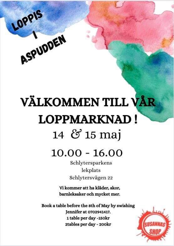 PM ditt namn och info om vad du ska sälja av loppisprylar. Sista dag för anmälan: 5/5. Ta med egna bord/ stolar.